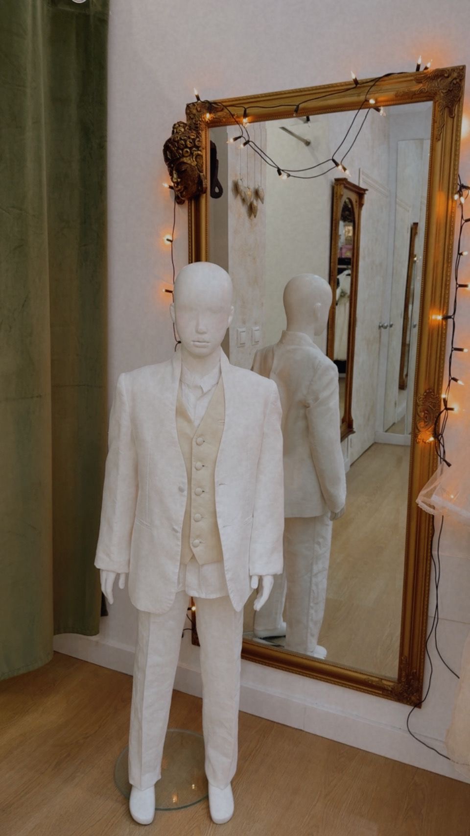 Consta de Chaqueta Blanca, chaleco beige, camisa blanca y pantalón blanco.