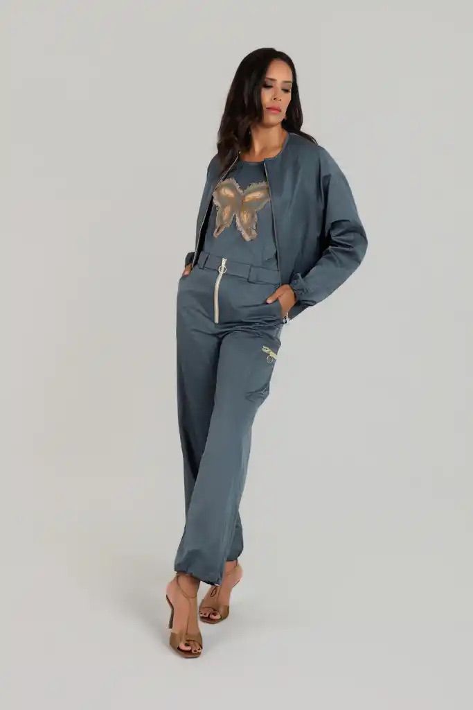Conjunto de cazadora, blusa y pantalon.