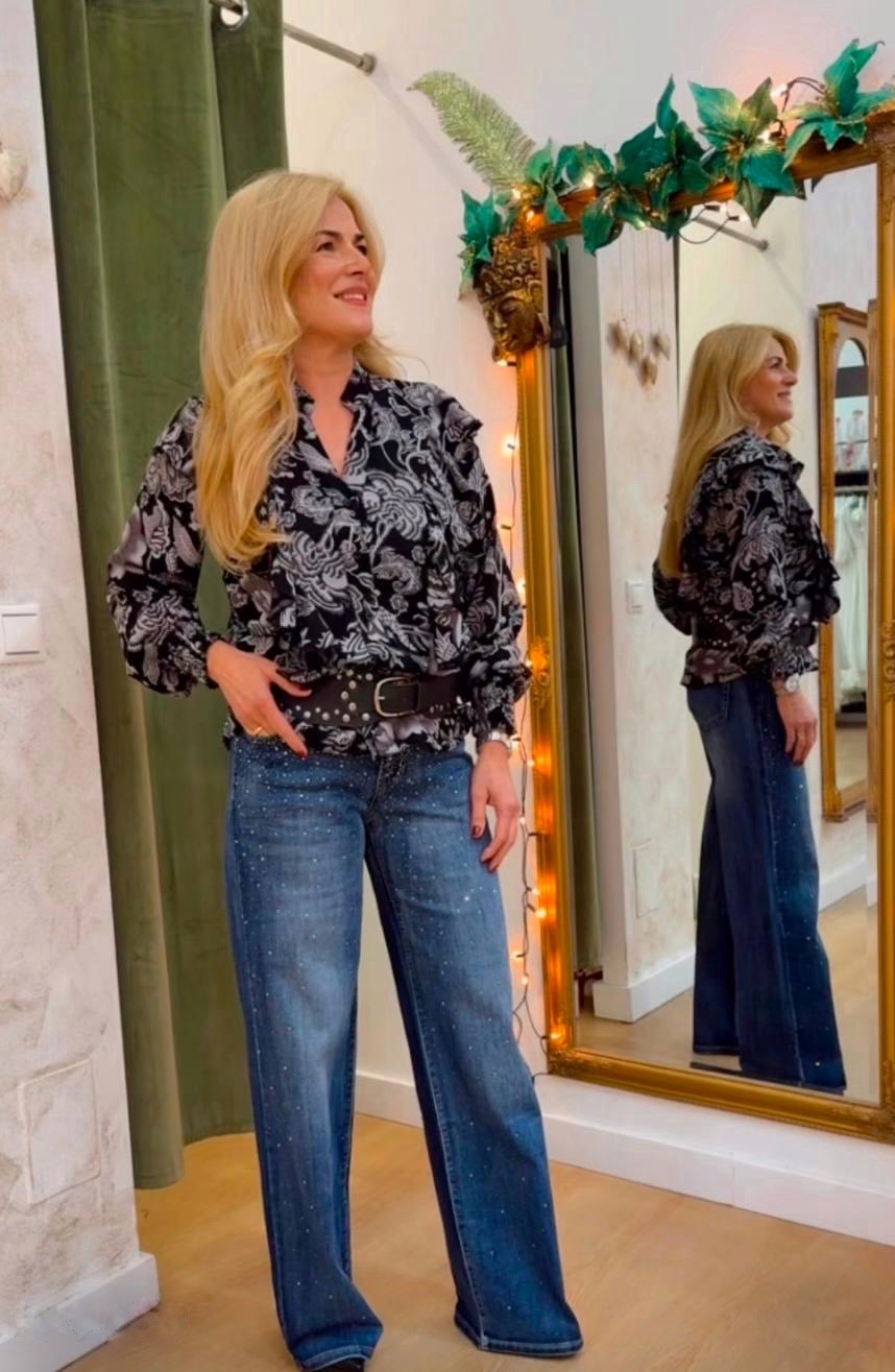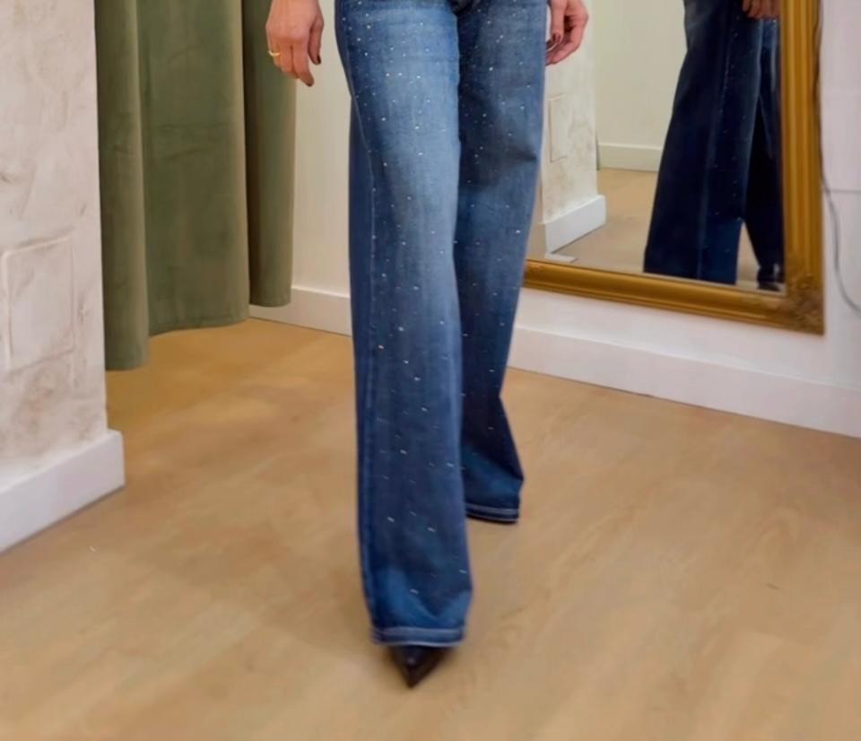 Pantalón vaquero Palazzo con cristales delanteros Aura