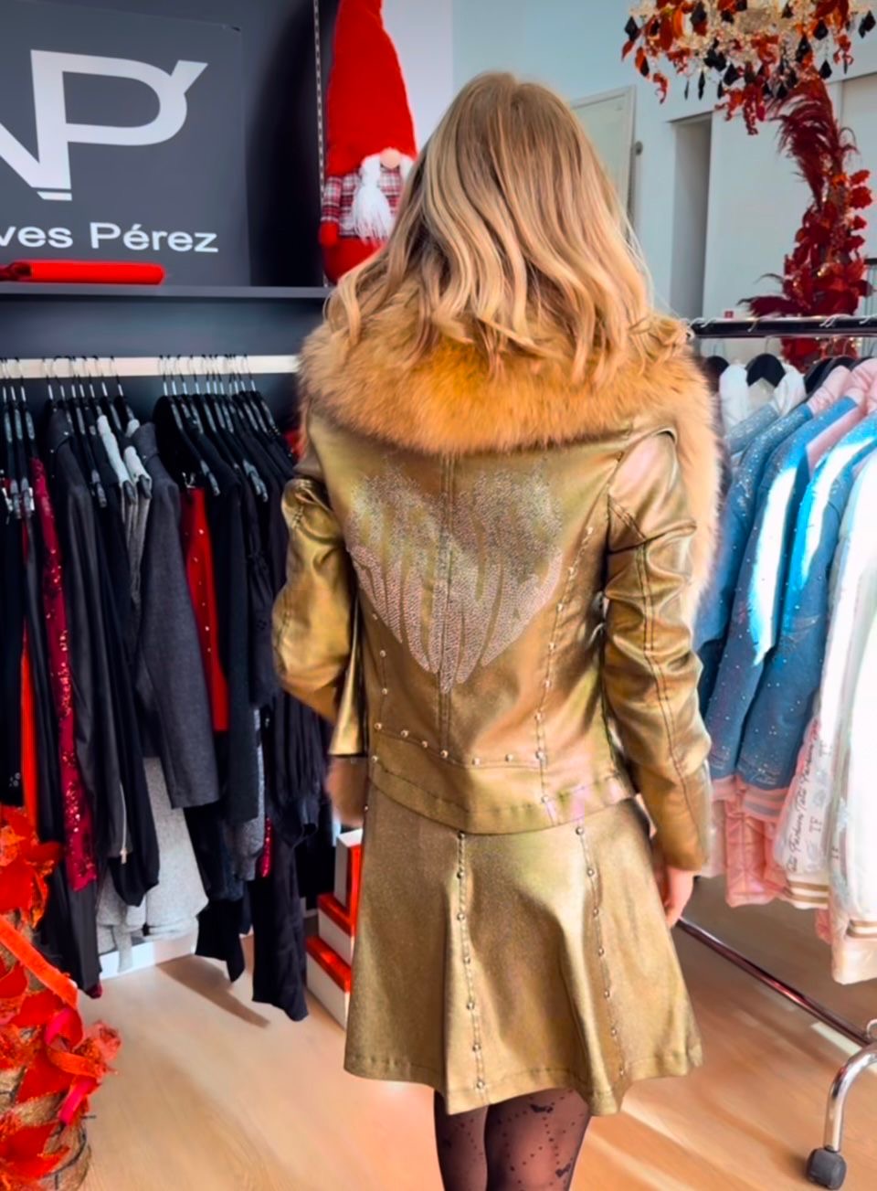 Traje de chaqueta con corazón en llamas en la espalda de tachuelas y cristales