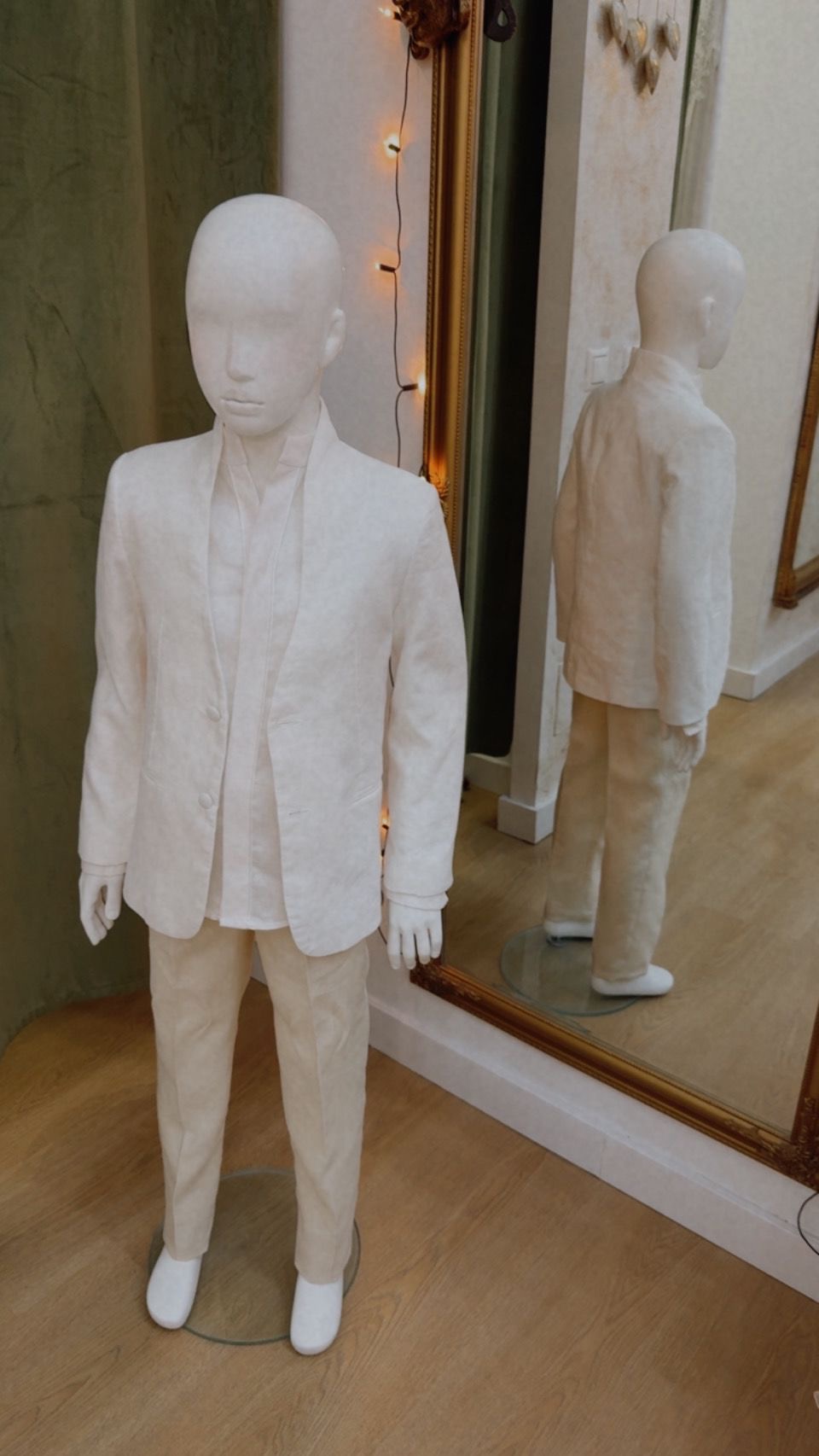 Consta de chaqueta y camisa de color blanco y pantalón de color beige