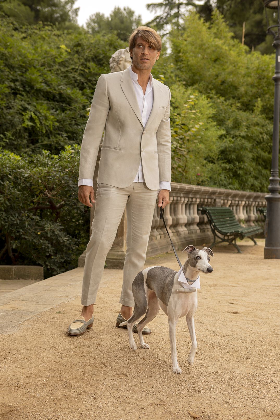 Traje de lino beig, de chaqueta, cuello solapa y pantalón de Manuel Pardo