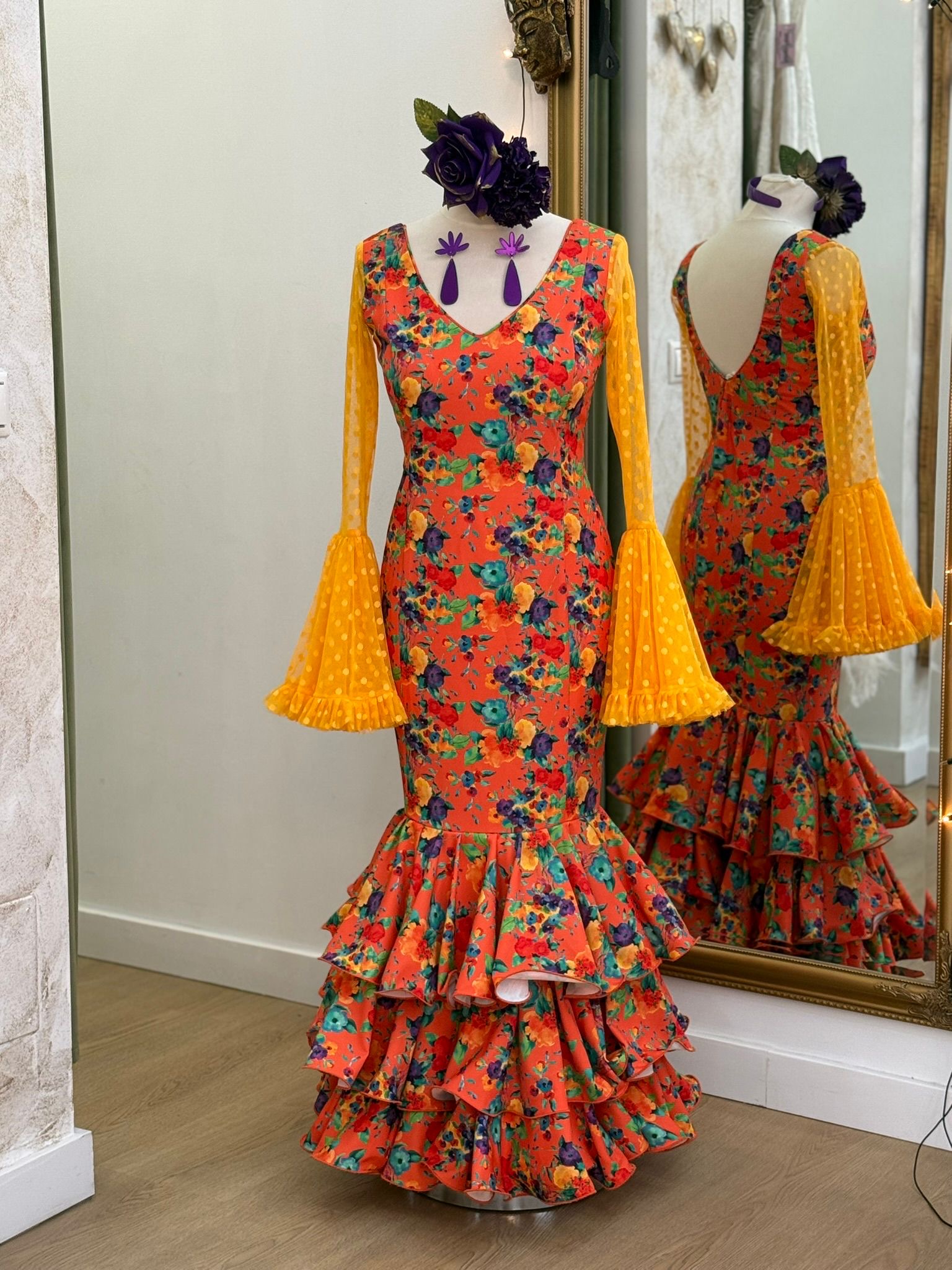 Sol de Feria, un vestido que baila entre flores, con cuerpo de fuego y mangas que acarician la luz. Puro arte hecho volantes.