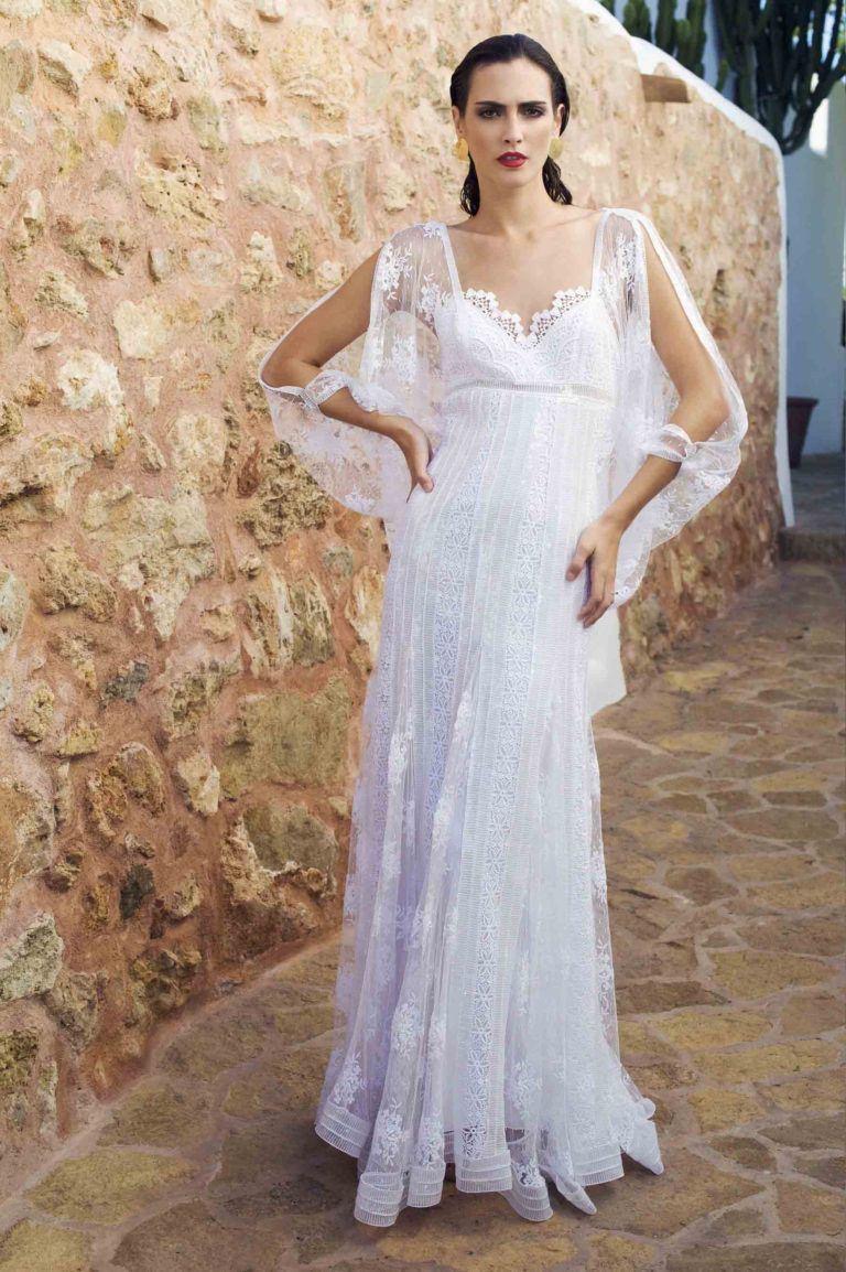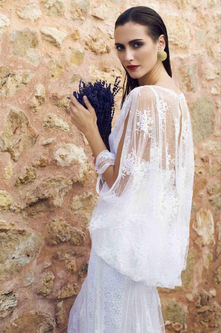 El vestido Stella es una oda al romanticismo bohemio. Confeccionado en delicado encaje blanco, destaca por su corte vaporoso y su caída suave que aporta ligereza y movimiento. El escote en V y las mangas tipo capa añaden un toque etéreo y femenino, ideal para novias que buscan naturalidad sin renunciar a la elegancia.